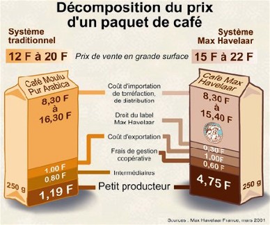 24 pays producteurs de café sont représentés par l'association. Sur un paquet de 250 gr le producteur touche environ 0,15 euro avec le système de distribution classique, avec le commerce équitable sa part croit à 0,60.